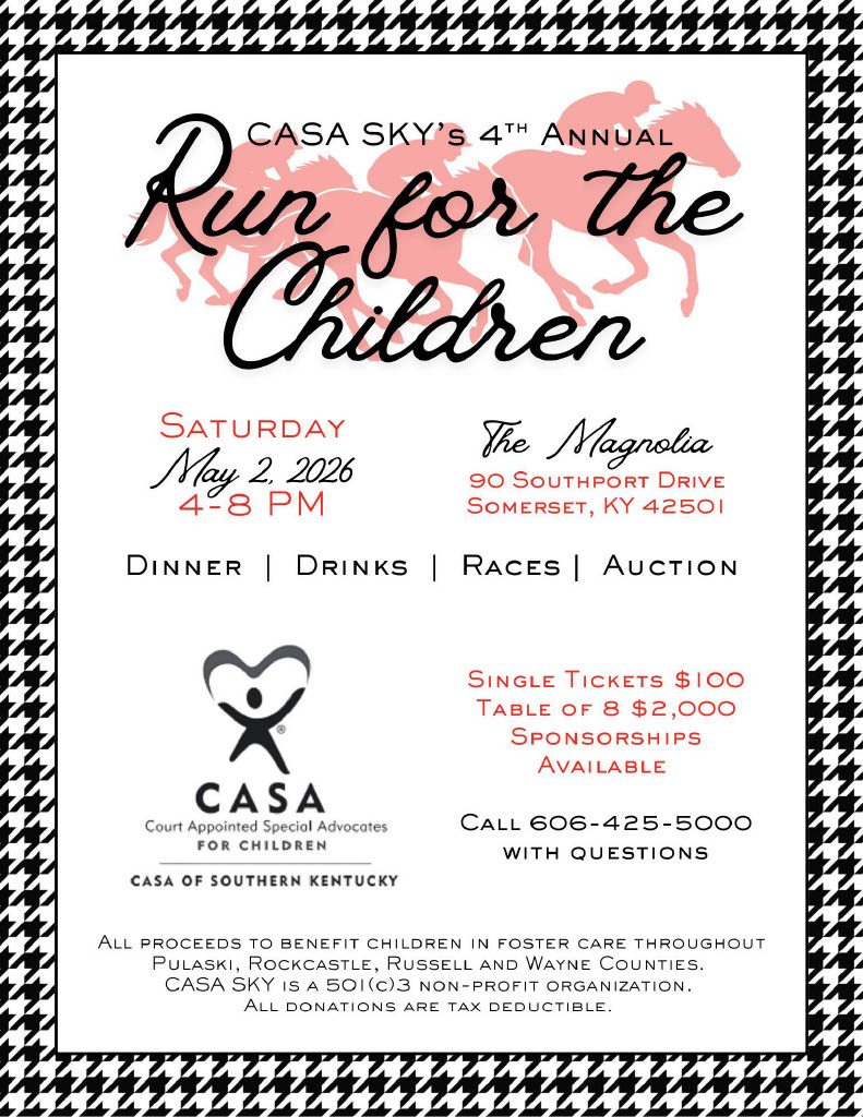 CASA of Southern Kentucky invites you to an evening of purpose, celebration, and community at our 4th Annual Run for the Children. This special Derby-themed event brings friends, supporters, and advocates together to raise funds for children in foster care throughout Pulaski, Rockcastle, Russell, and Wayne Counties.